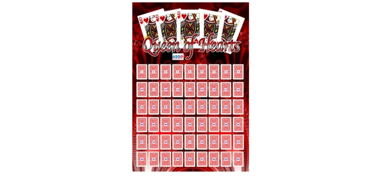2. To begin, 54 playing cards including two jokers are placed in sealed envelopes, face down on a mounting board purchased from a certified gaming vendor; the envelopes are numbered one (1) through fifty-four (54). The game board will be displayed and sealed in the Social Quarters, with the QUEEN OF HEARTS as the “Jackpot Card”.
